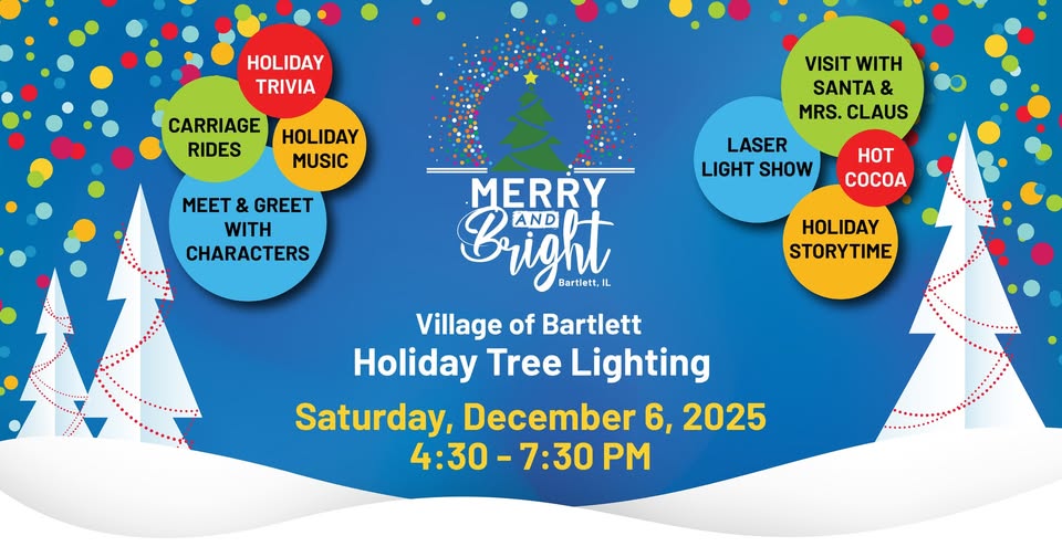 Mark your calendar for free holiday fun in Bartlett! Please join the Village of Bartlett, the Bartlett Area Chamber of Commerce, the Lions Club, Bartlett Public Library, and the Park District for the Merry and Bright Holiday Tree Lighting in Bartlett Park at North Avenue and Oak Avenue on Saturday, December 6 between 4:30-7:30 pm. Families are invited to stop in the Log Cabin for […]